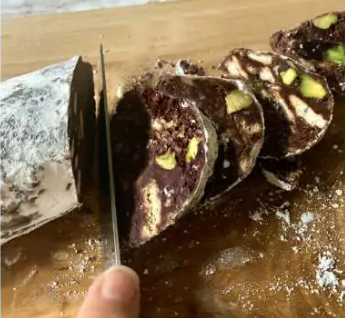 Despite its name, there’s no meat involved in chocolate salami. The dessert mimics the appearance of salami with its cylindrical shape and speckled interior made from pieces of broken biscuit cookies and nuts.