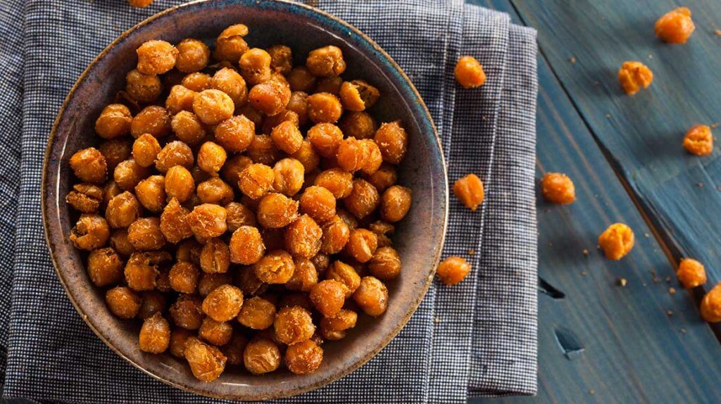 Preheat your oven to 350. Mix all ingredients together in a bowl until chickpeas are coated evenly.  Spread out mixture on flat sheet pan and bake until crispy—about 45 minutes to 1 hour. Allow to cool and serve as a snack or side dish.