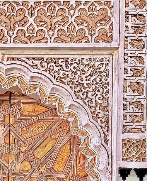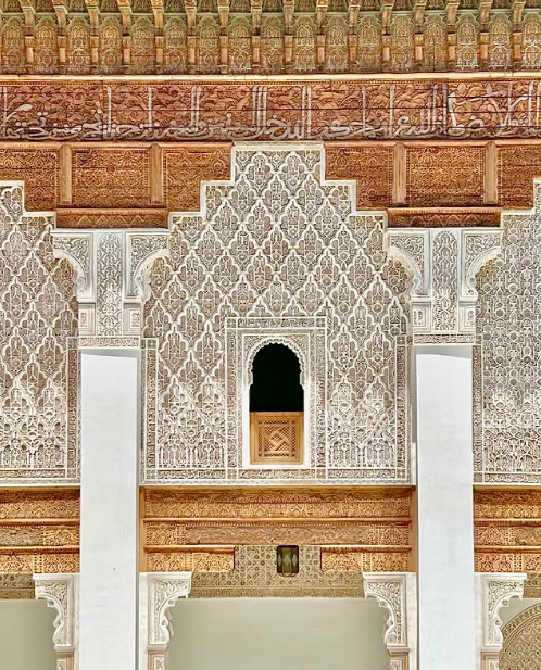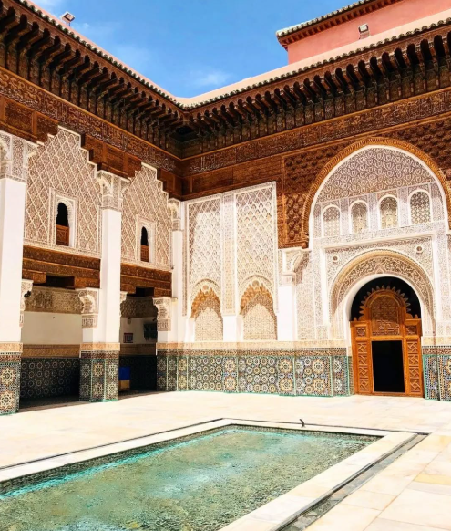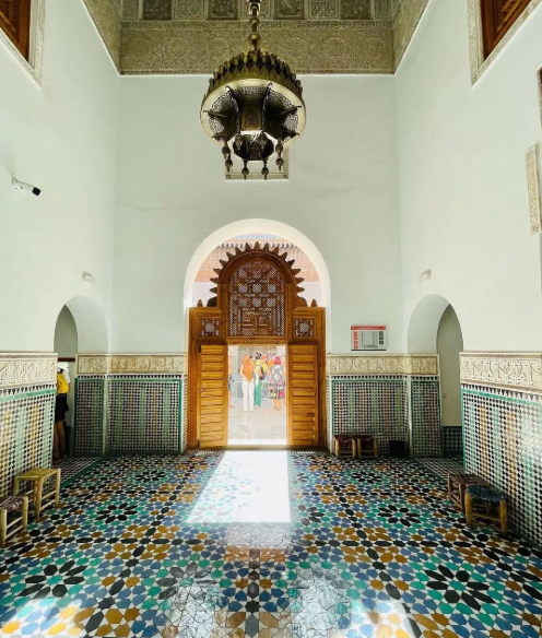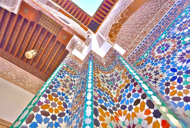 The architectural grace of the madrasa reflects the artistic zenith of the Marinid dynasty, celebrated patrons of Islamic art. The madrasa’s design reflects the intricate geometric patterns, ornate stucco work, and vibrant tilework characteristic of Moroccan architecture. Its central courtyard, surrounded by elaborately carved cedar wood doors and marble columns, exemplifies the beauty and craftsmanship of Islamic design.