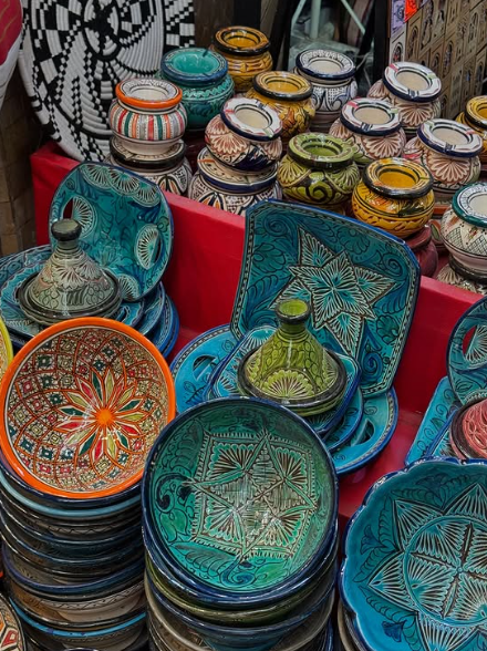 This ancient walled section of Marrakech has been a center of trade and culture for centuries, serving as a crossroads for travelers, merchants, and scholars from across the globe. The buildings press close on either side, their walls painted in shades of ochre and terracotta. Now and then an alley will pop you out into the iconic Jemaa el-Fnaa square, or to the imposing walls of the Marrakech Museum. You find yourself drawn into the vibrant souks, where stalls overflow with colorful textiles, shimmering lanterns, and intricately crafted ceramics (of which I brought home quite a few colorful bowls and serving platters).
