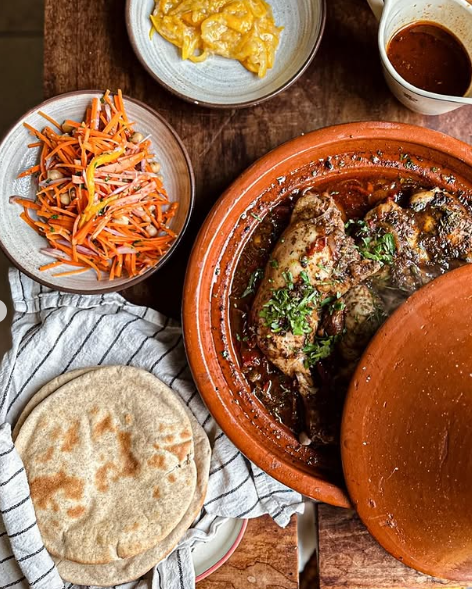 Tagine: a slow-cooked stew made in a conical clay pot. It can contain a variety of ingredients including lamb, chicken, vegetables, and a rich mix of spices, often enhanced with dried fruits like apricots or raisins and eaten with a piece of bread instead of cutlery.
